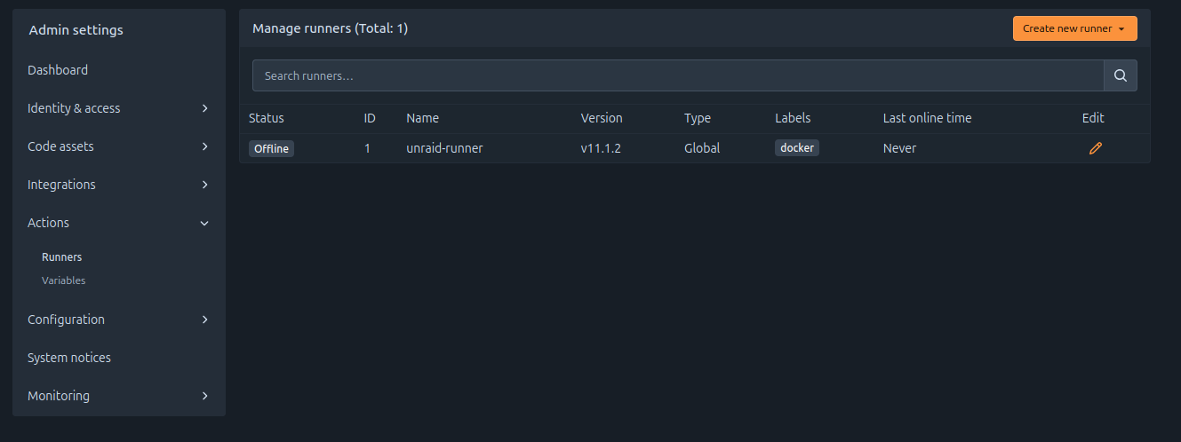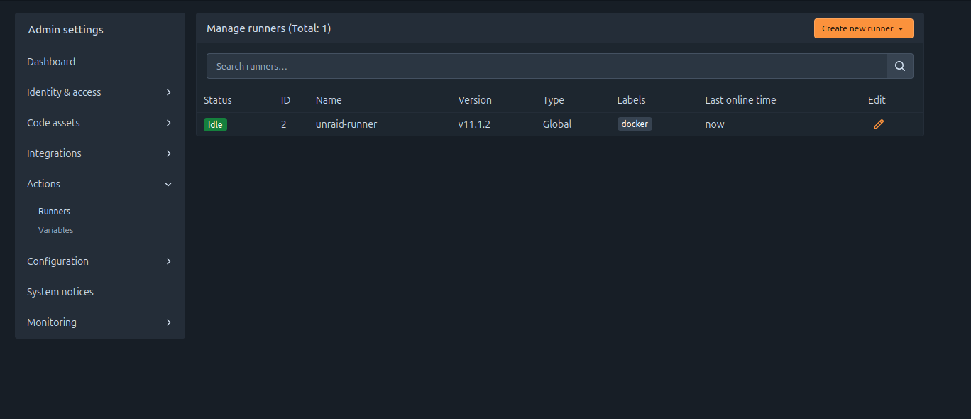 docker compose up -dThe runner status should now show as Idle and appear green: