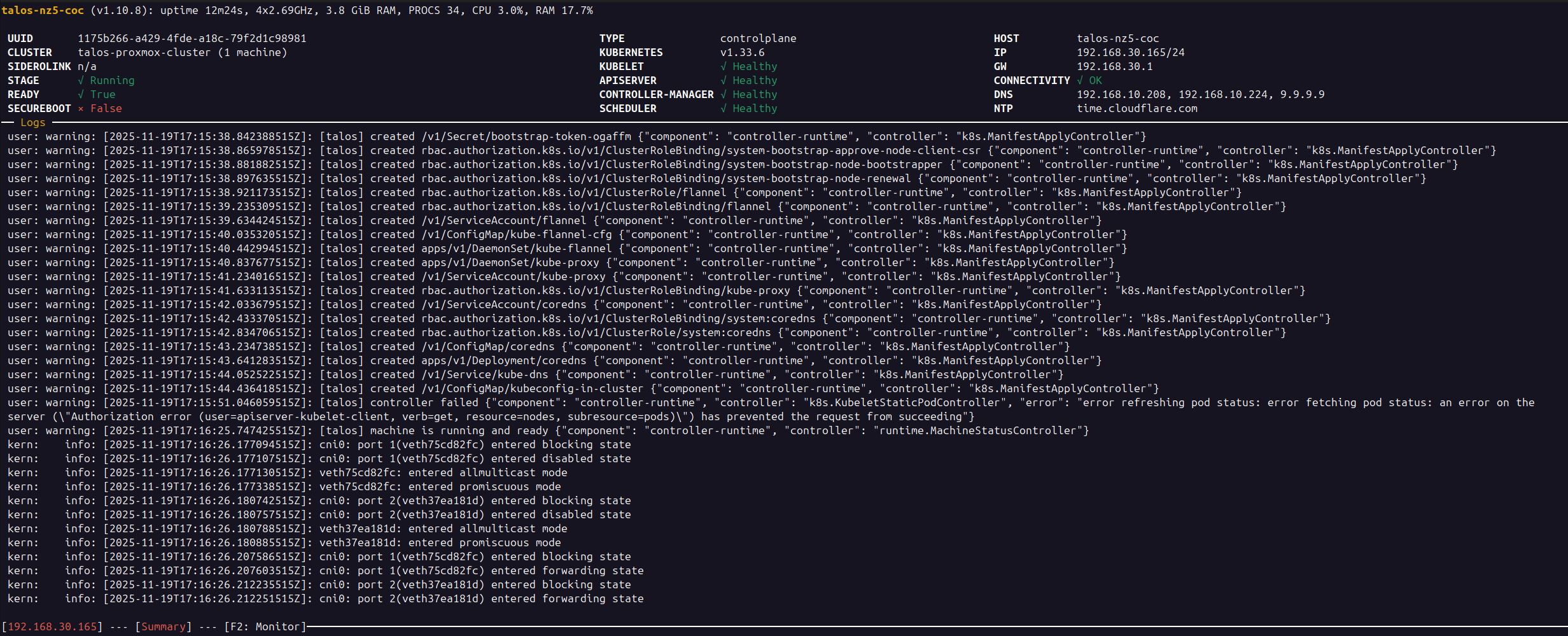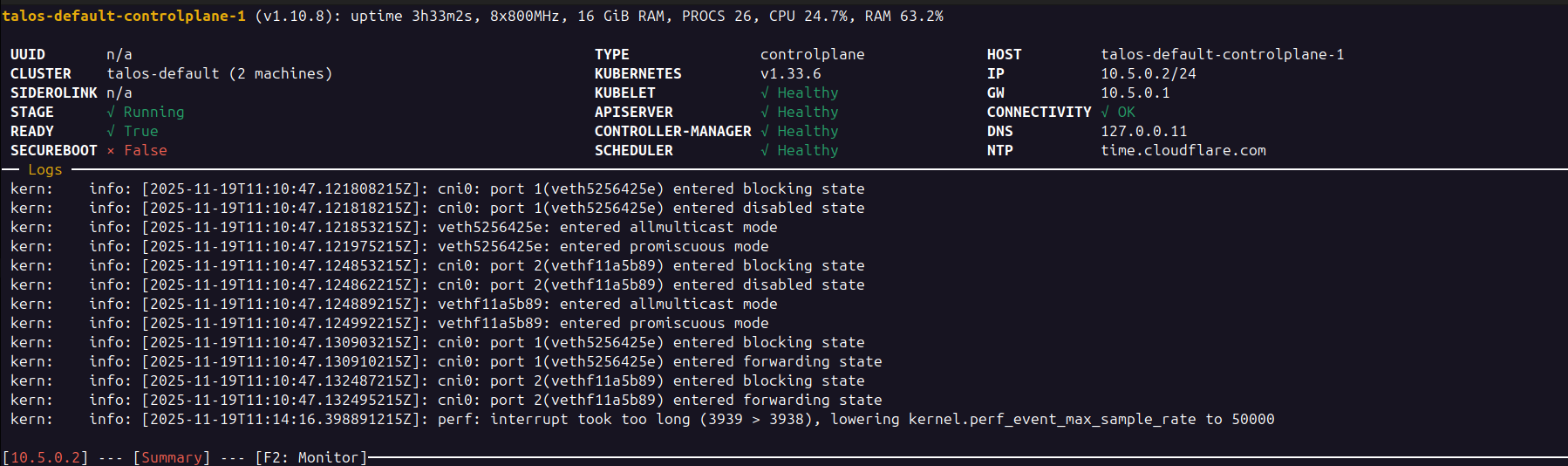 talos-default-controlplane-1 Ready control-plane 30m v1.33.6 10.5.0.2 <none> Talos (v1.10.8) 6.14.0-35-generic containerd://2.0.7
